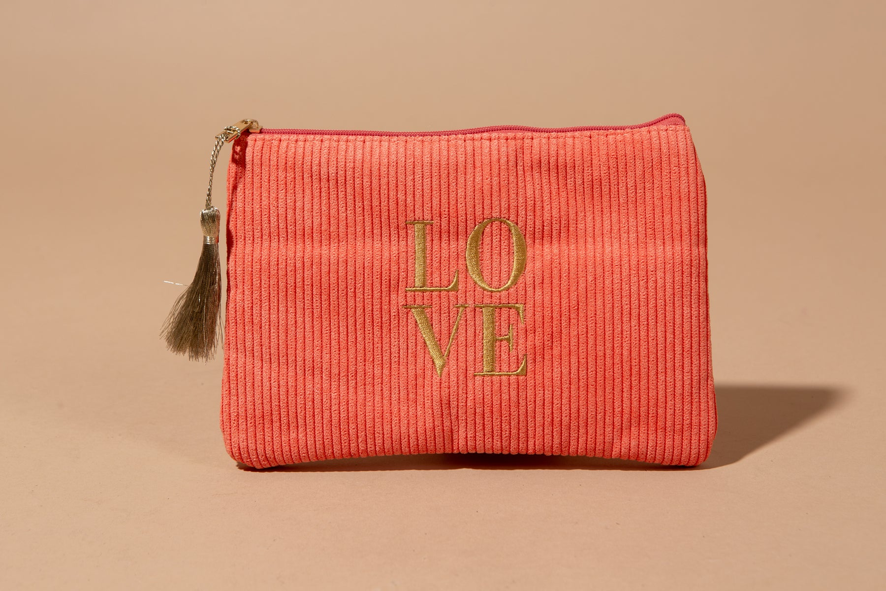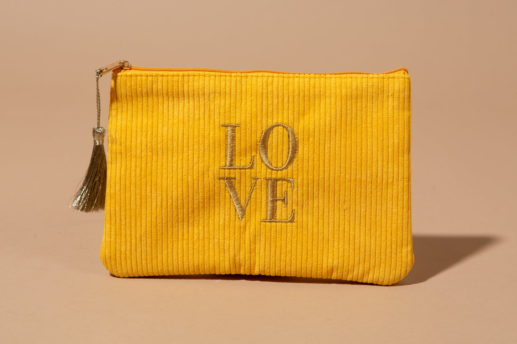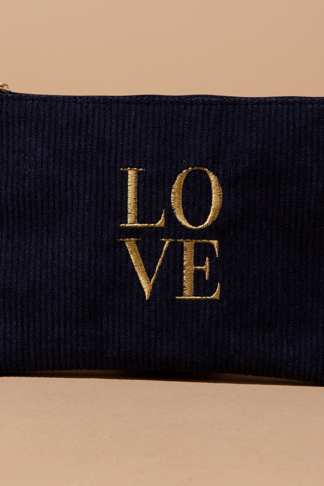 Add a touch of texture and personality to your essentials with the Love Make Up Bag. Perfect for stashing makeup, small tech accessories, or travel necessities, this pouch combines a soft, plush corduroy finish with charming details that make it a standout piece.