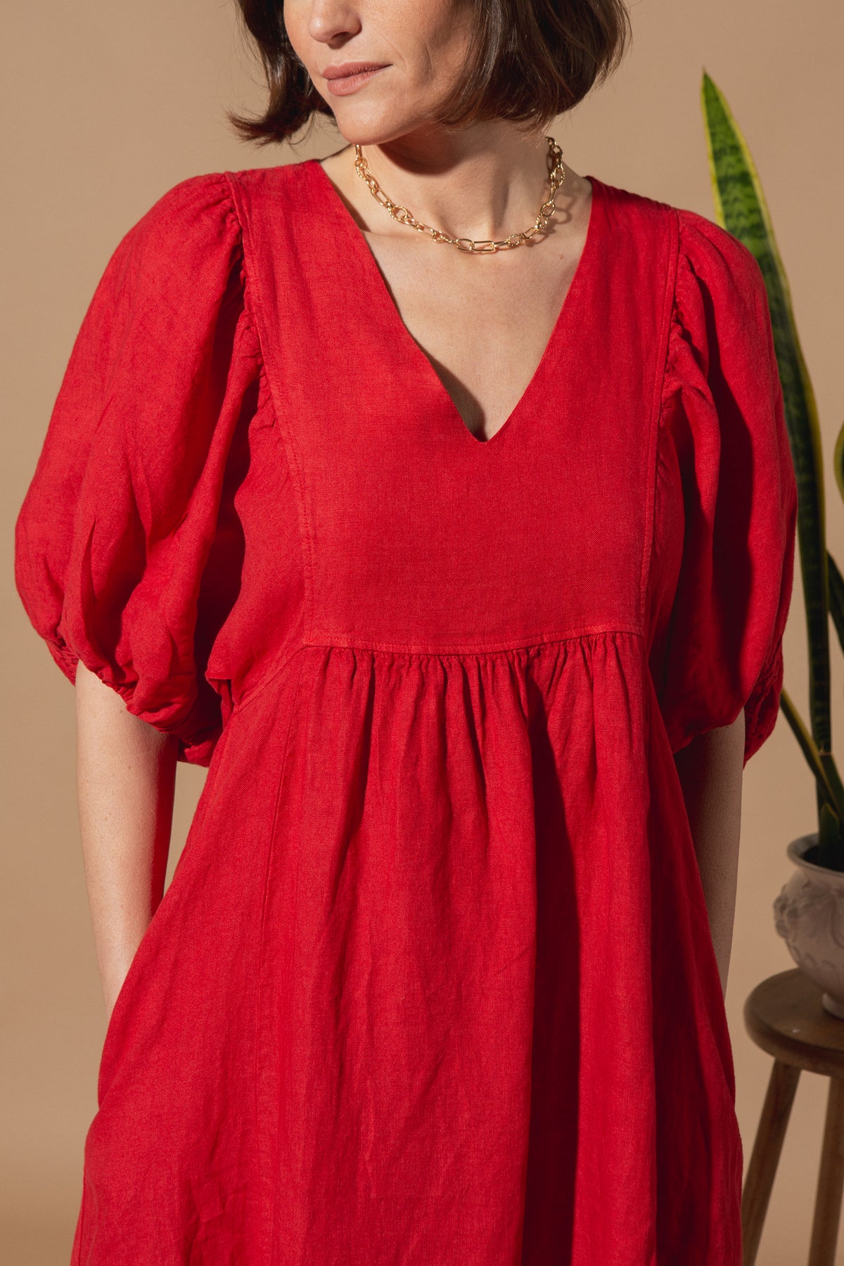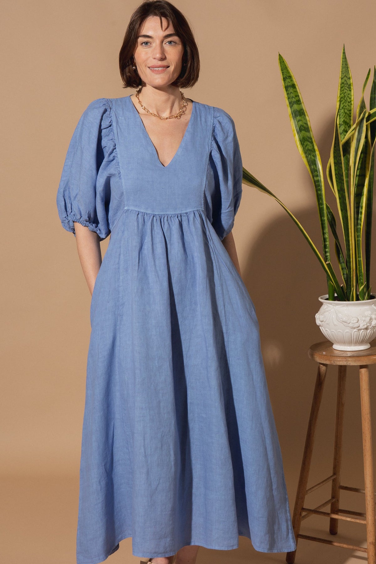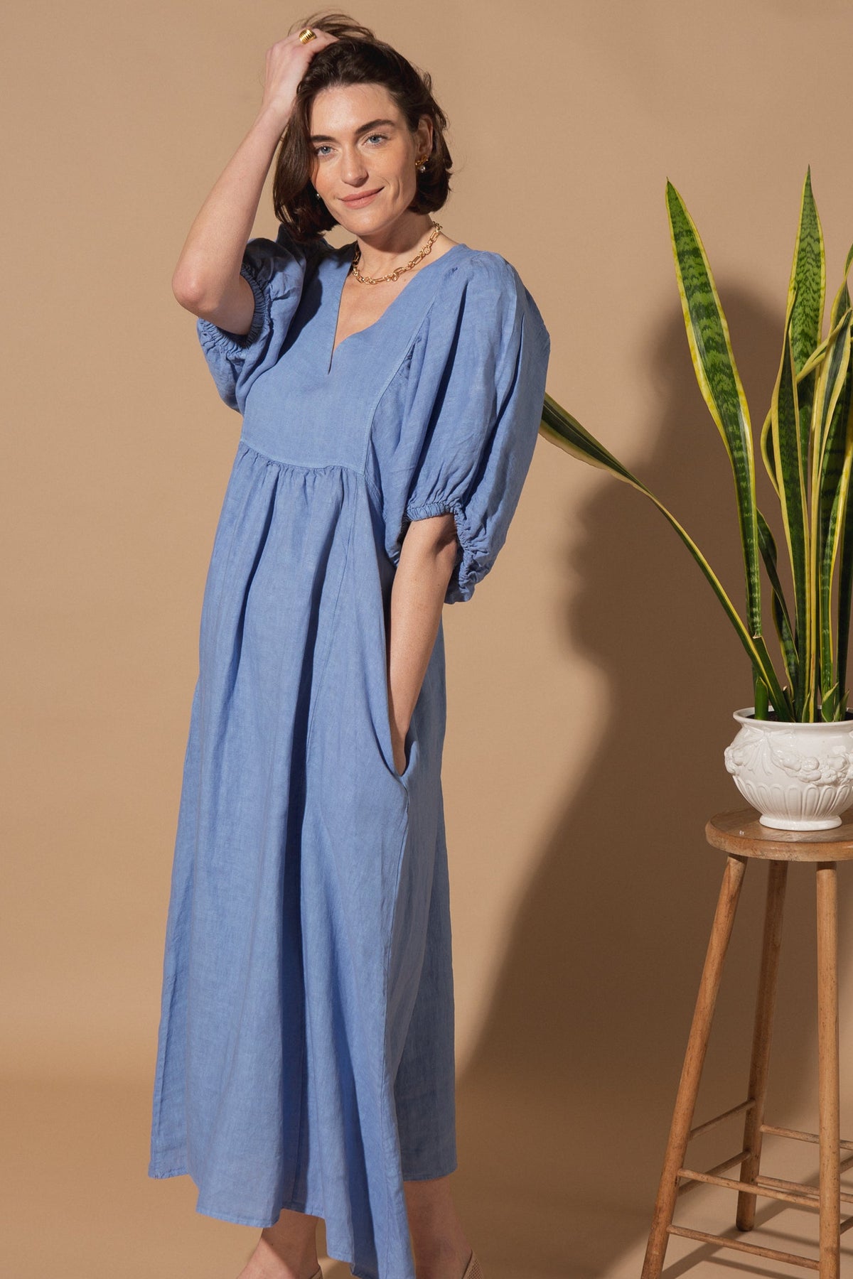 This linen dress has been designed with a relaxed silhouette, a soft V-neckline, and a gently gathered waist for easy, all-day wear. With gorgeous puff-sleeve detailing and available in four beautiful colours, this dress will be a staple in your customer's wardrobe.
