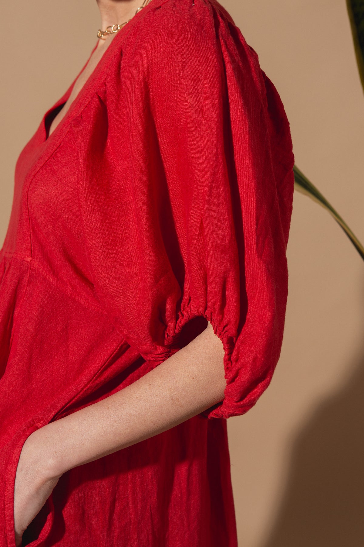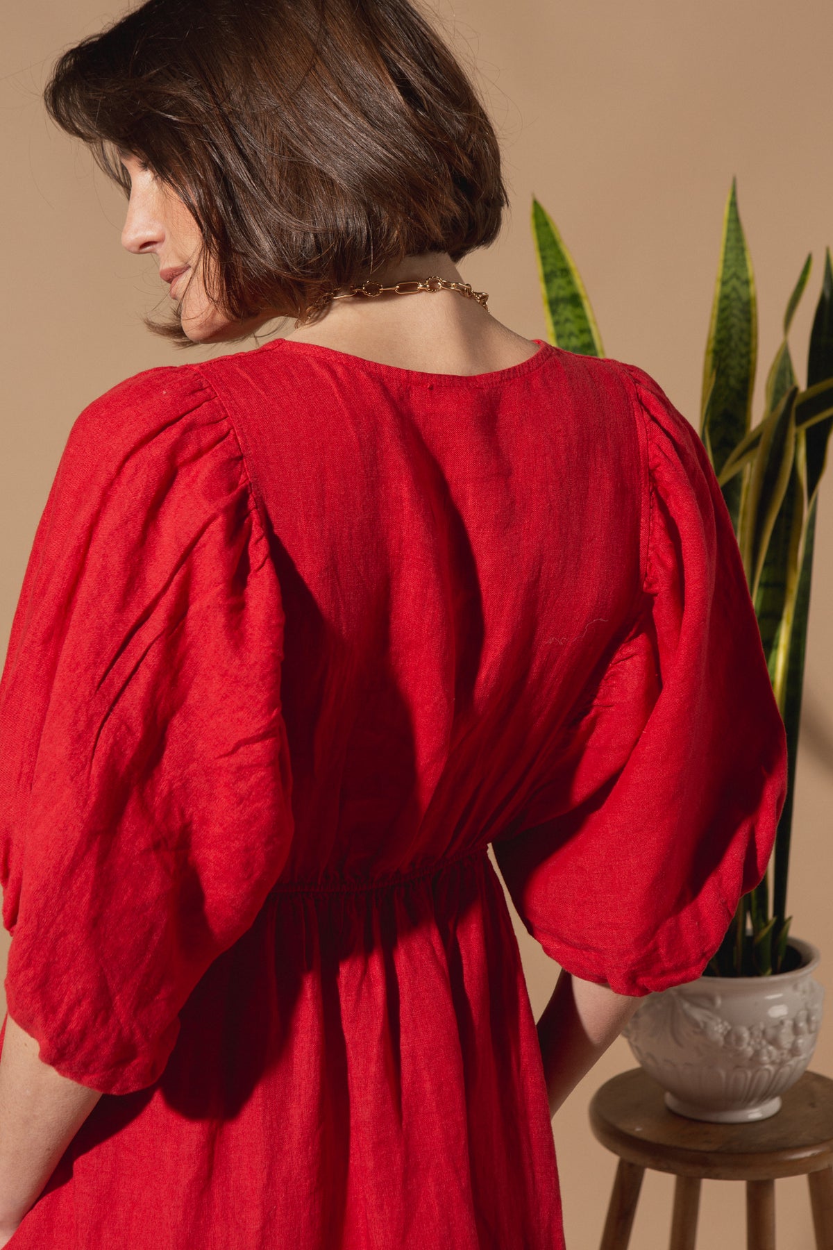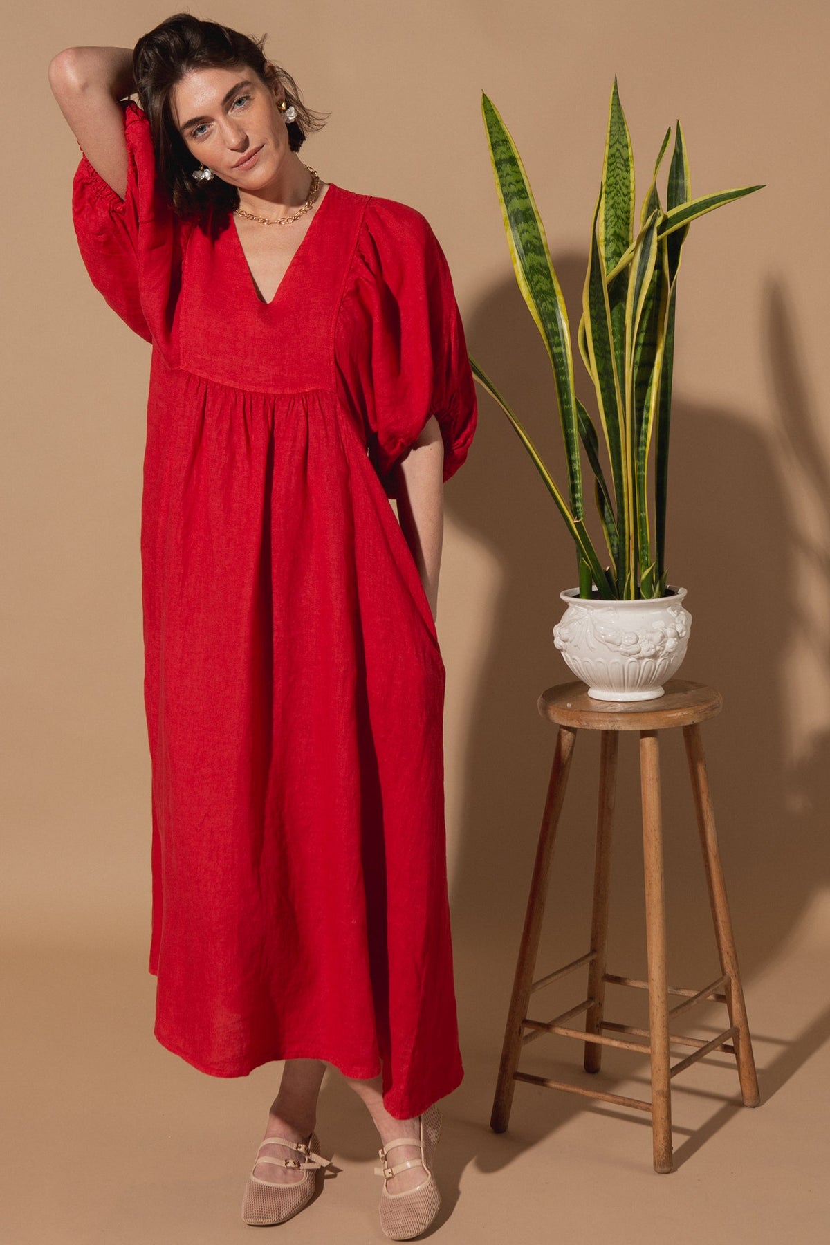 This linen dress has been designed with a relaxed silhouette, a soft V-neckline, and a gently gathered waist for easy, all-day wear. With gorgeous puff-sleeve detailing and available in four beautiful colours, this dress will be a staple in your customer's wardrobe.