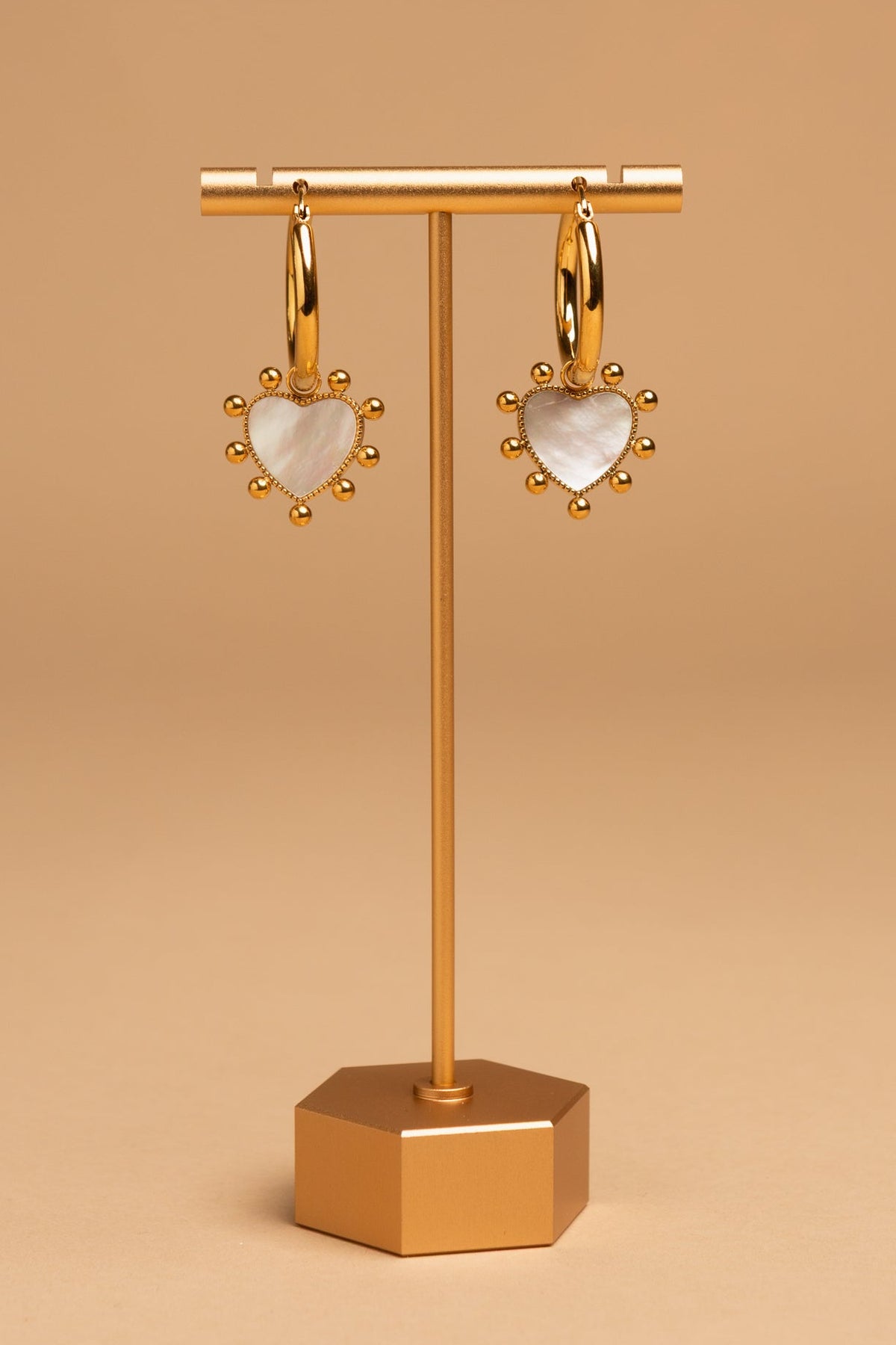 Polished gold-tone hoops with pearl heart drops. A modern, feminine update on a classic hoop.