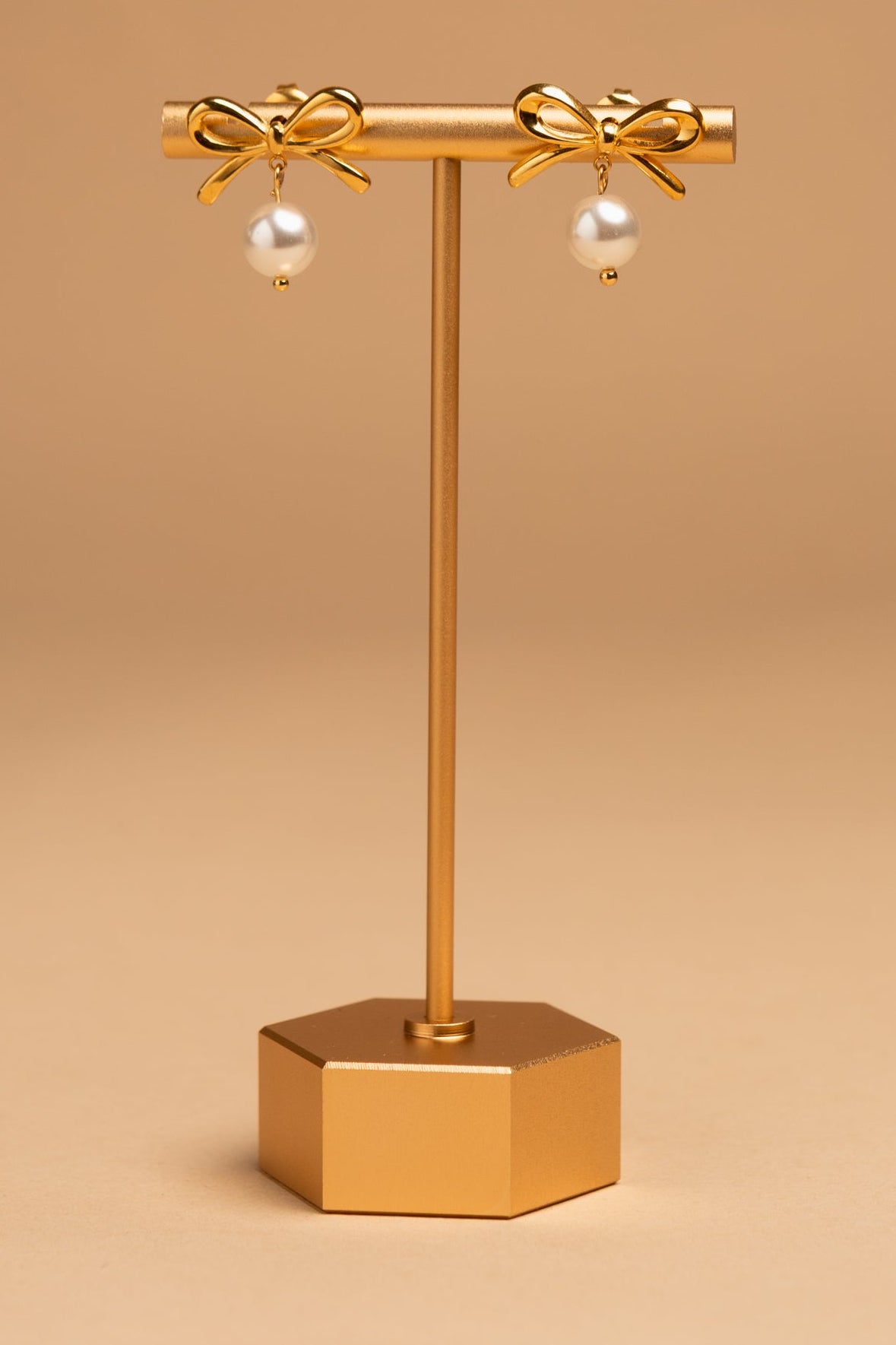 Gold-tone bow stud earrings finished with a single pearl drop. A delicate, feminine style with timeless appeal.