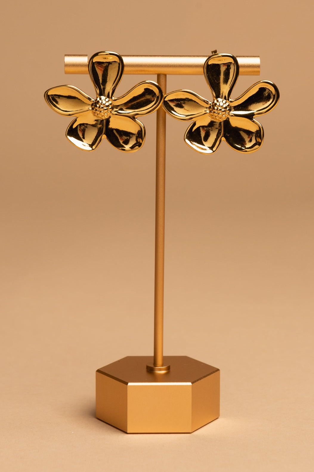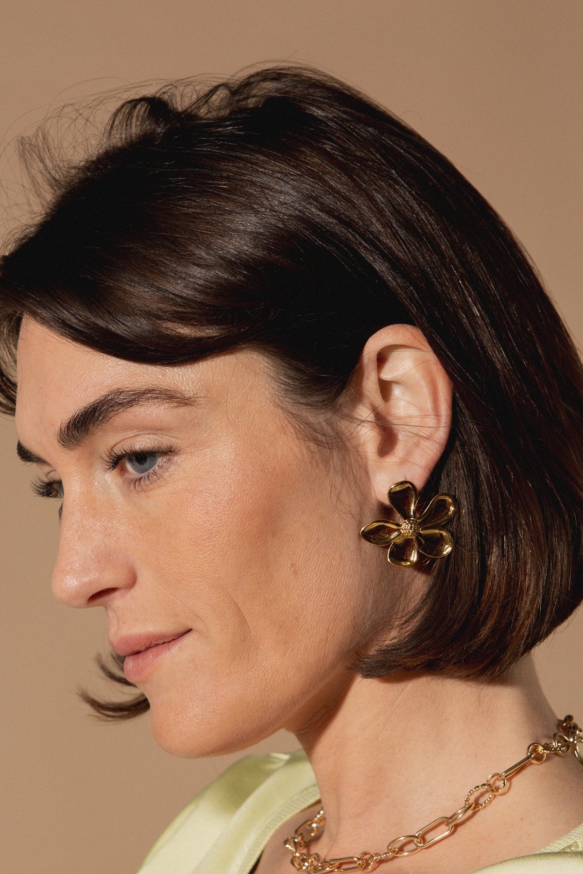 High-shine gold-tone flower stud earrings with sculptural petal detailing. A statement style that adds instant impact to everyday looks.
