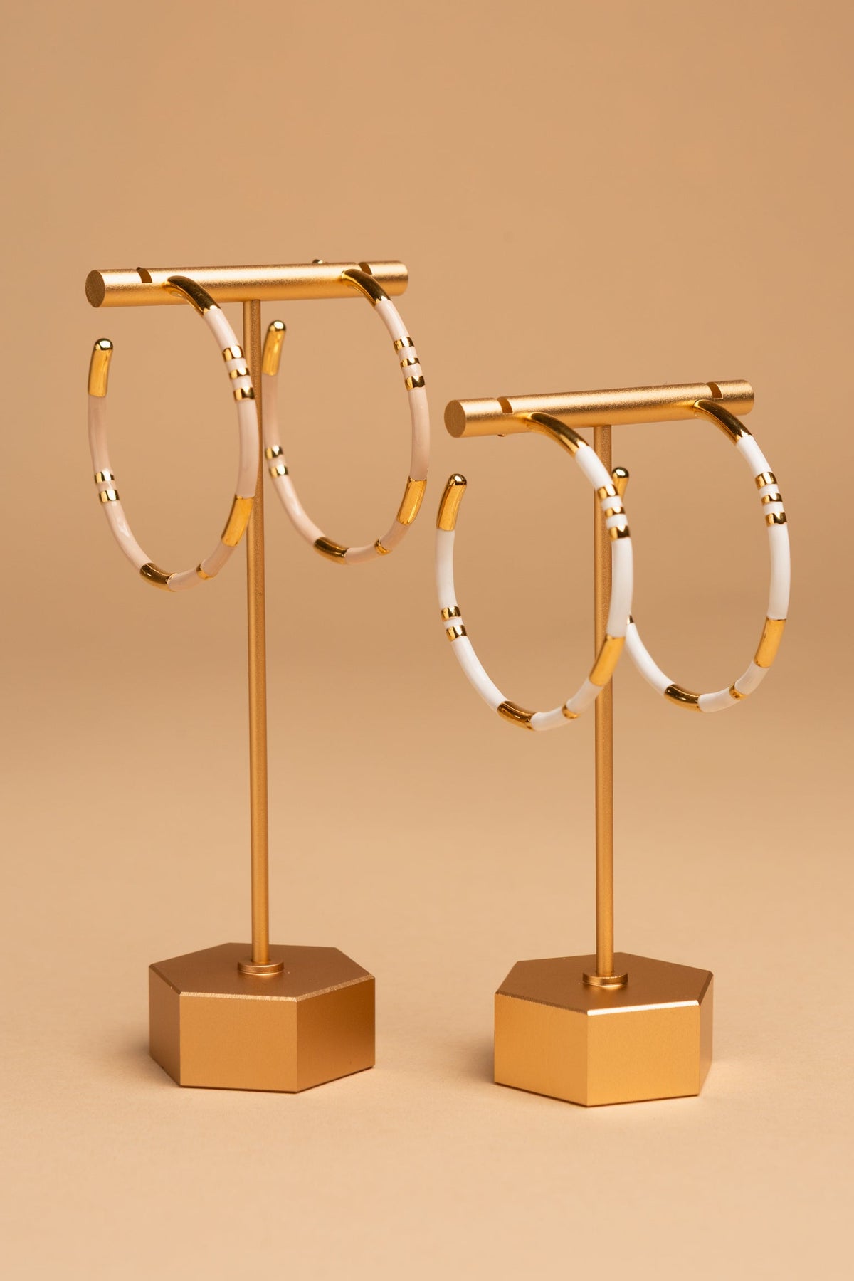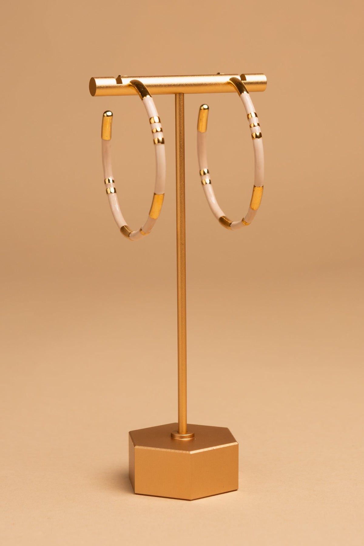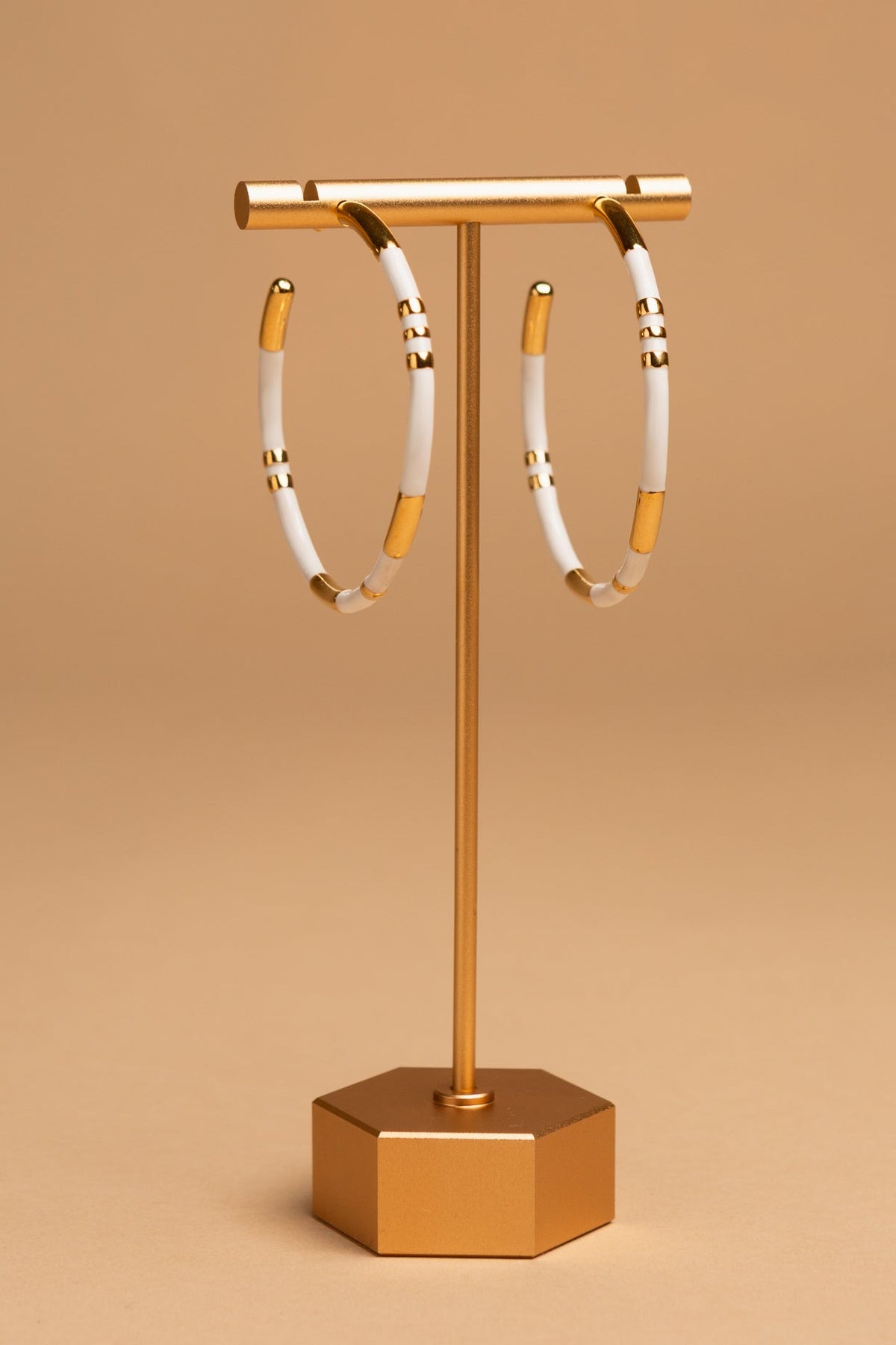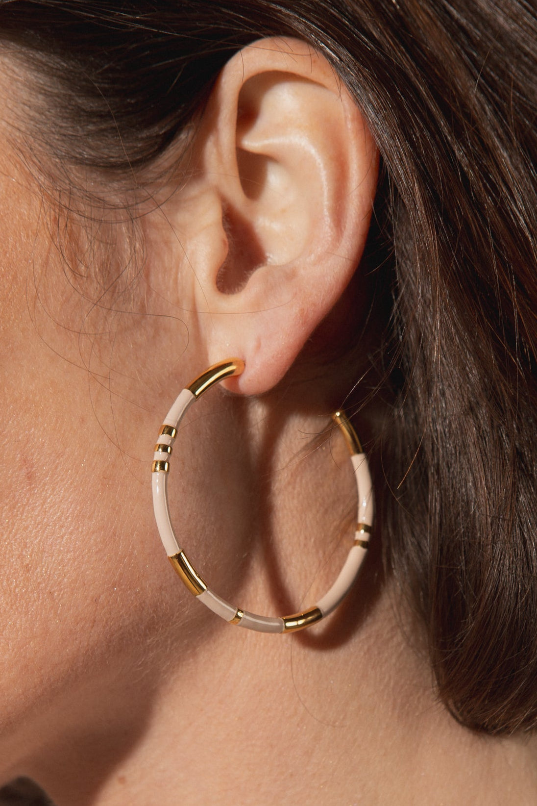 Gold-tone hoop earrings with smooth enamel detailing, available in white or beige. A timeless staple with a fresh, contemporary feel.