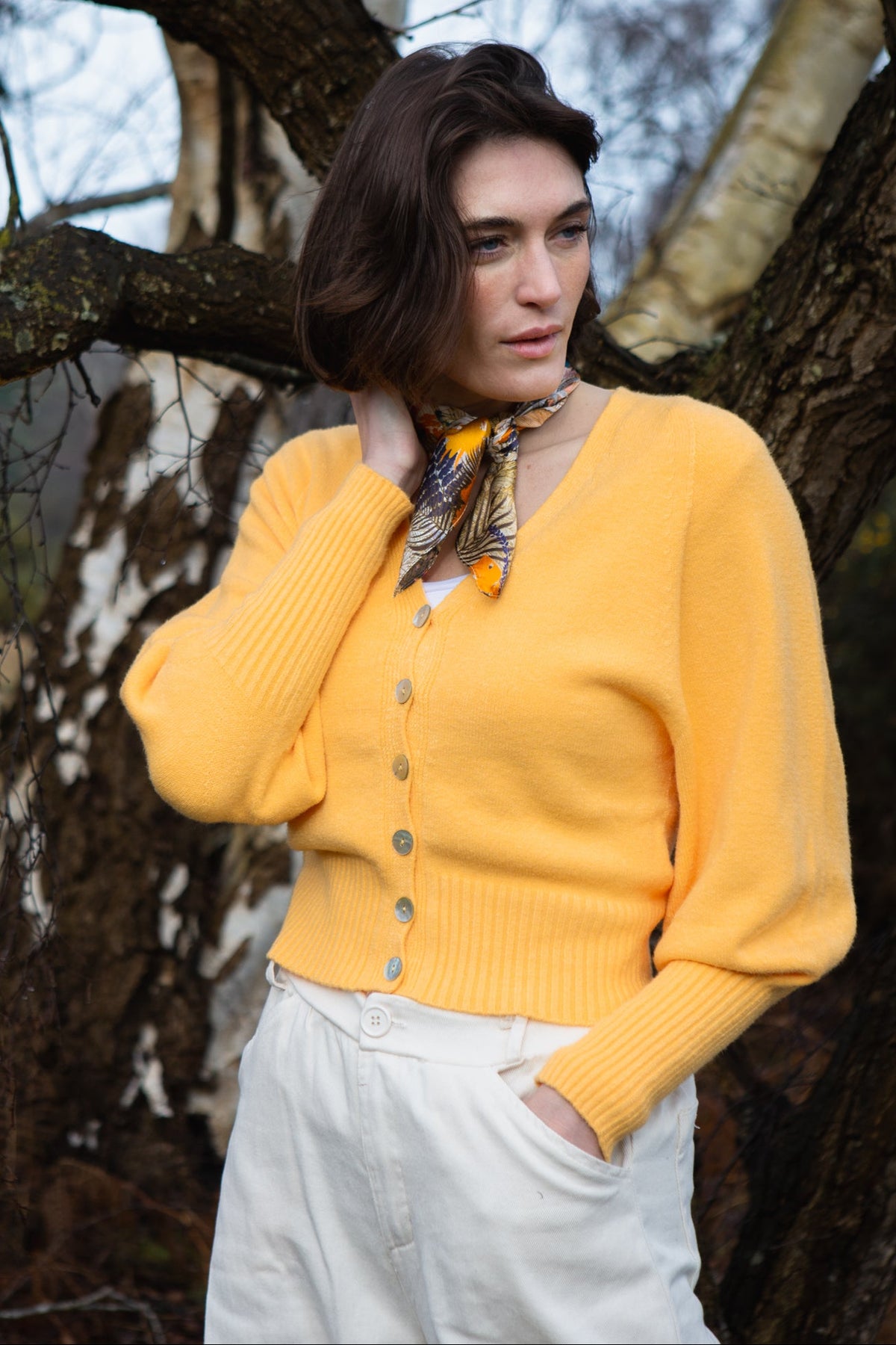 This piece is a modern take on a classic silhouette, combining a soft-touch knit with a playful, yet elegant, puff-sleeve design. The V-neckline and delicate button-front create a flattering shape, making it an ideal choice for both casual and more polished looks.