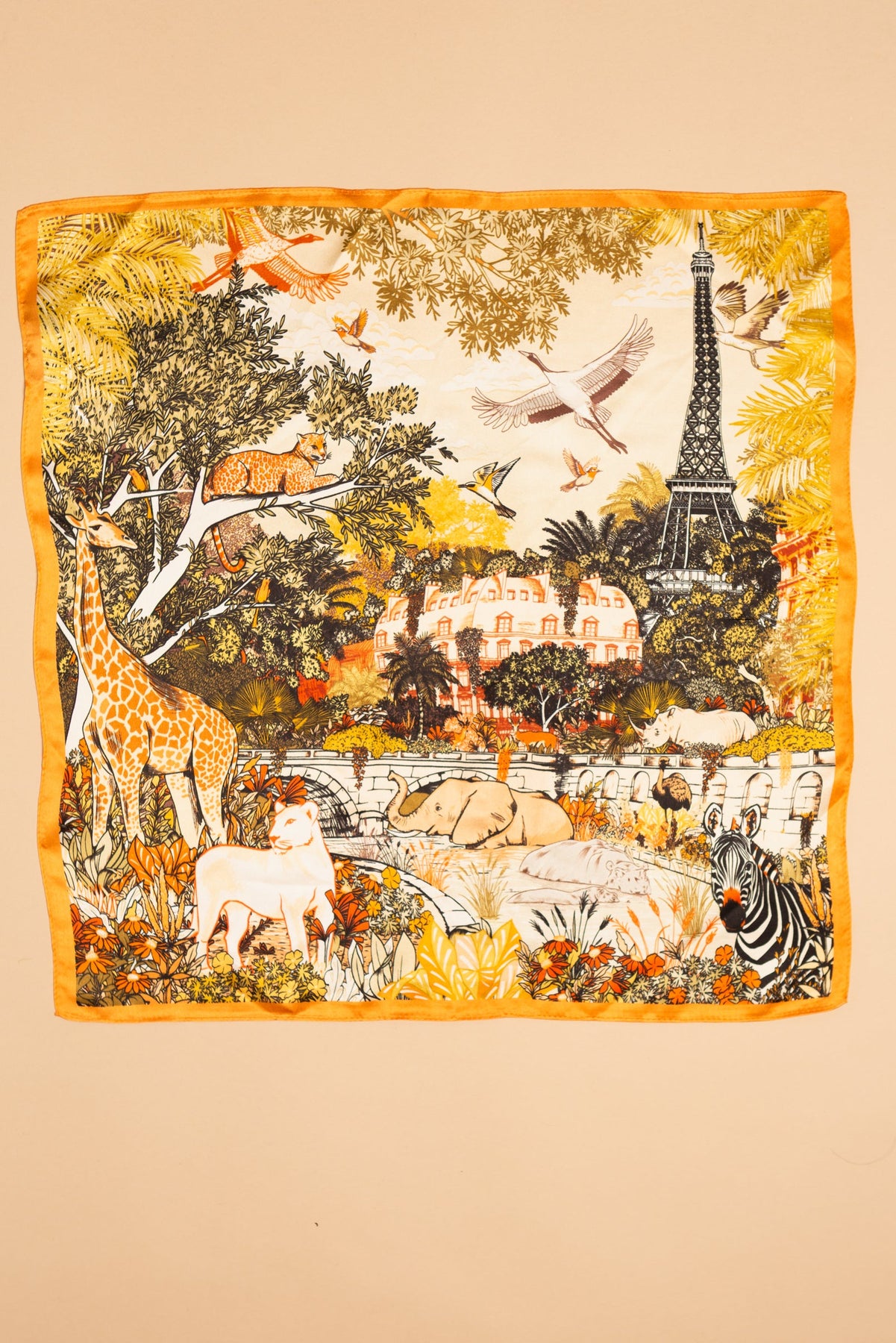 A charming small scarf crafted from 100% silk, featuring a whimsical illustrated scene in warm golden and soft neutral tones, finished with a contrasting border. Lightweight and silky to the touch, it’s ideal for styling at the neck, in your hair or tied to a bag