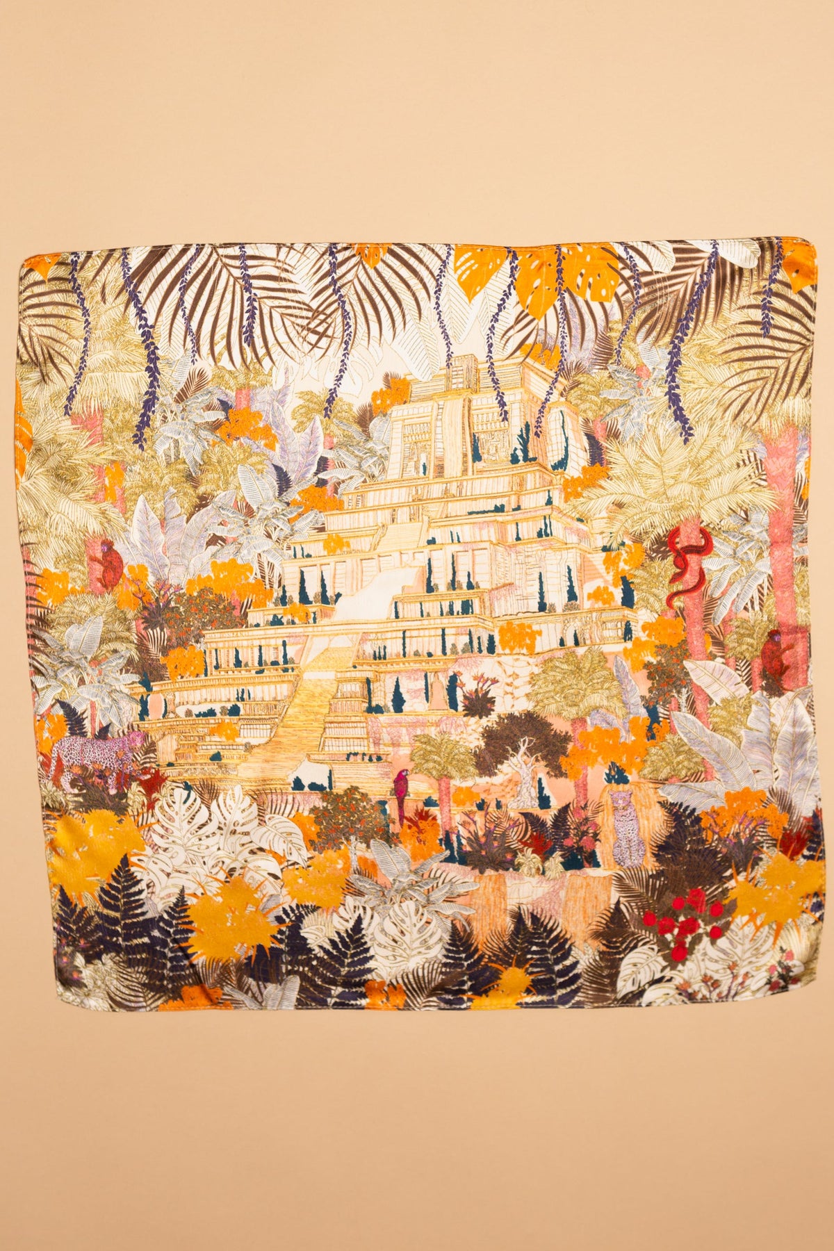A beautifully detailed small scarf made from 100% silk, showcasing an intricate illustrated design in warm tones. Soft, lightweight and luxurious, it’s perfect for adding colour and interest when worn at the neck, in your hair or tied to a handbag. A versatile finishing touch that elevates everyday outfits.