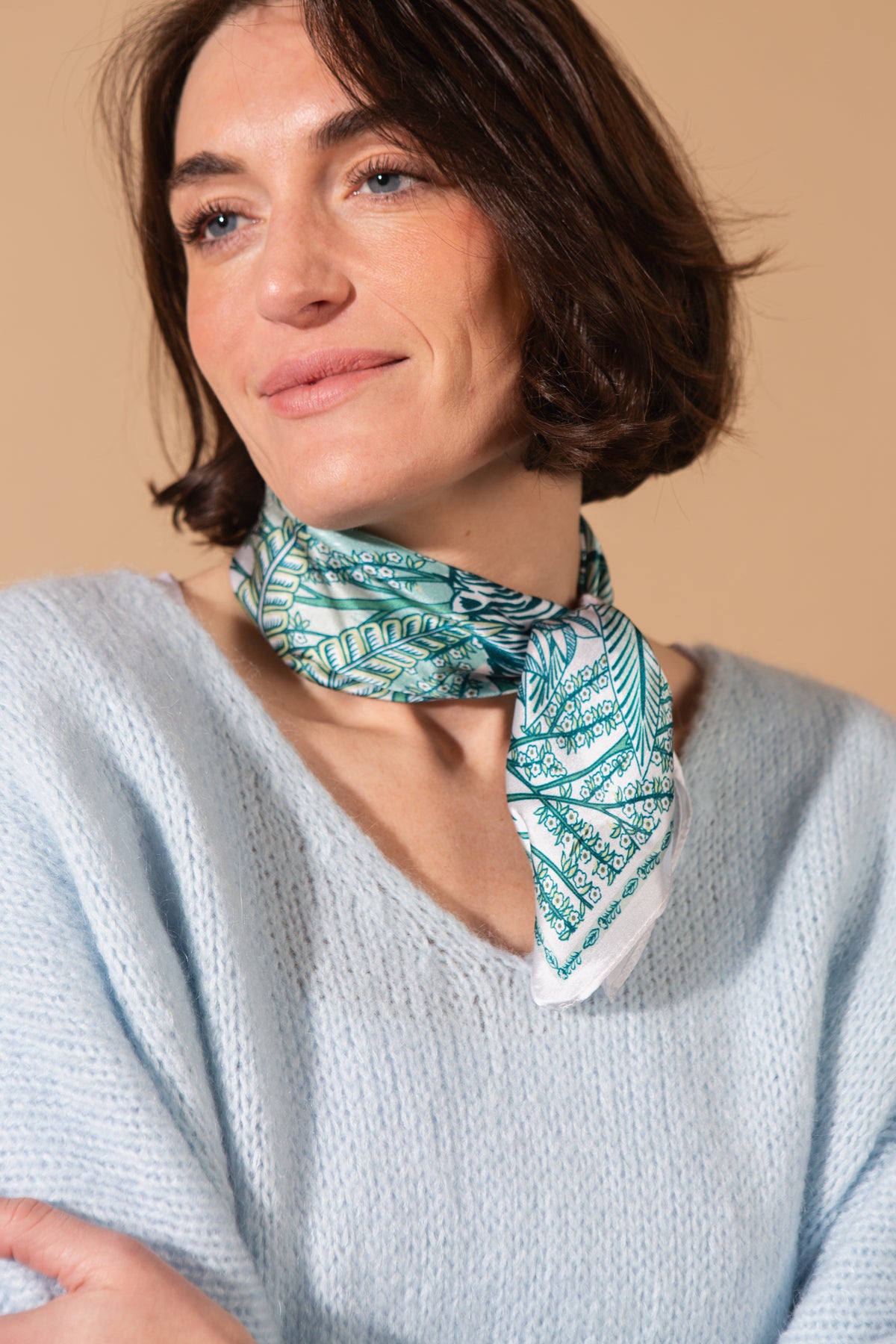A beautifully illustrated small scarf made from 100% silk, featuring a detailed jungle-inspired design in soft green tones. Lightweight with a smooth, luxurious finish, it’s perfect worn at the neck, in your hair or tied to a handbag for an elegant touch of pattern and colour.