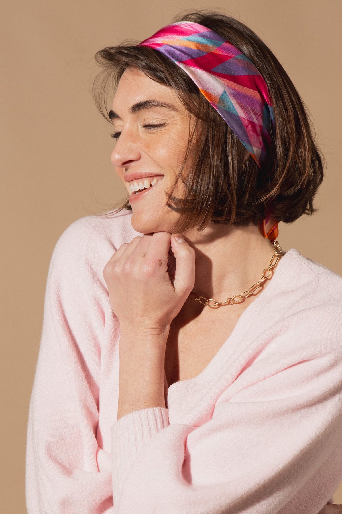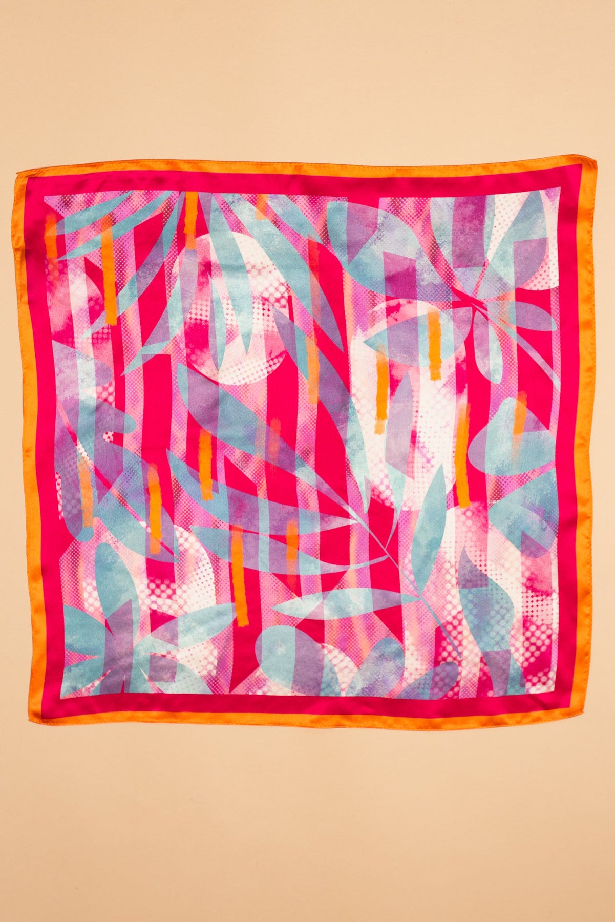 A vibrant small scarf crafted from 100% silk, featuring a bold abstract design in bright pinks with soft blue and warm orange accents. Lightweight with a smooth, luxurious feel, it’s perfect worn at the neck, in your hair or tied to a handbag for a confident pop of colour.