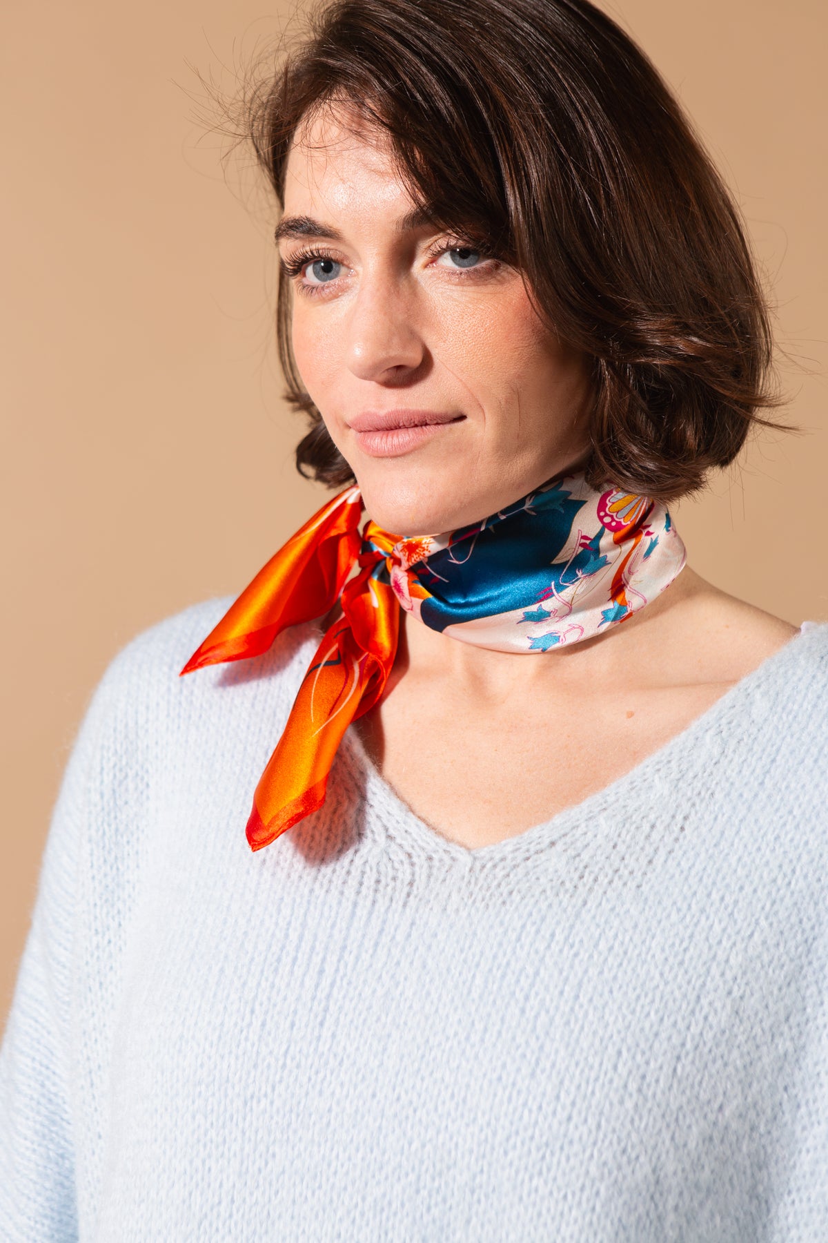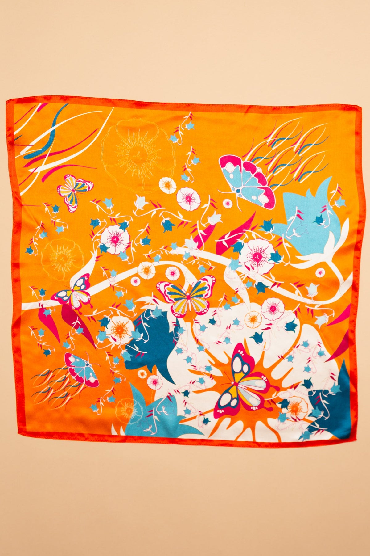 A vibrant small scarf crafted from 100% silk, featuring a lively floral and butterfly design in warm orange tones with pops of turquoise and pink. Lightweight, soft and beautifully smooth, it’s perfect worn at the neck, in your hair or tied to a handbag for a joyful splash of colour.