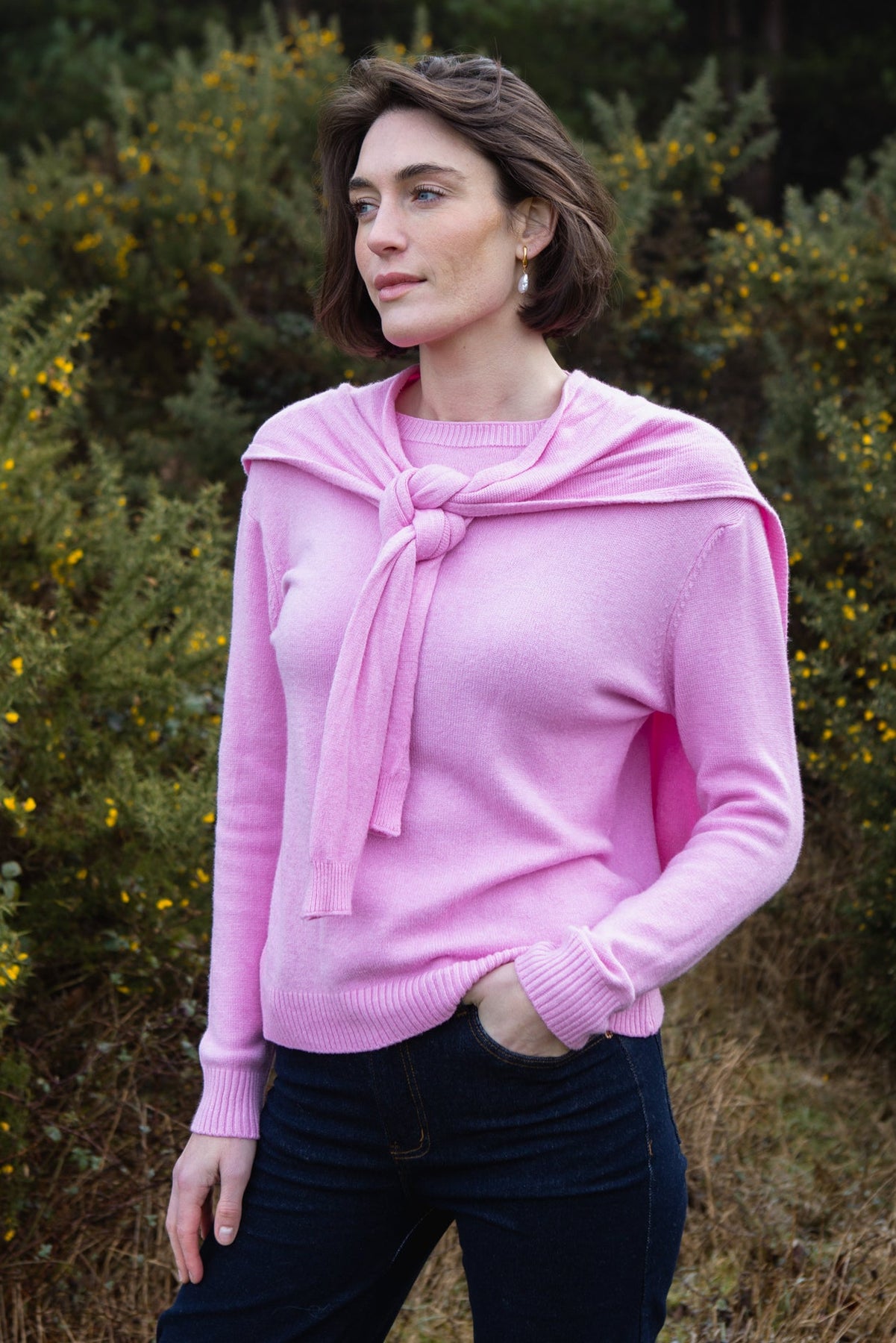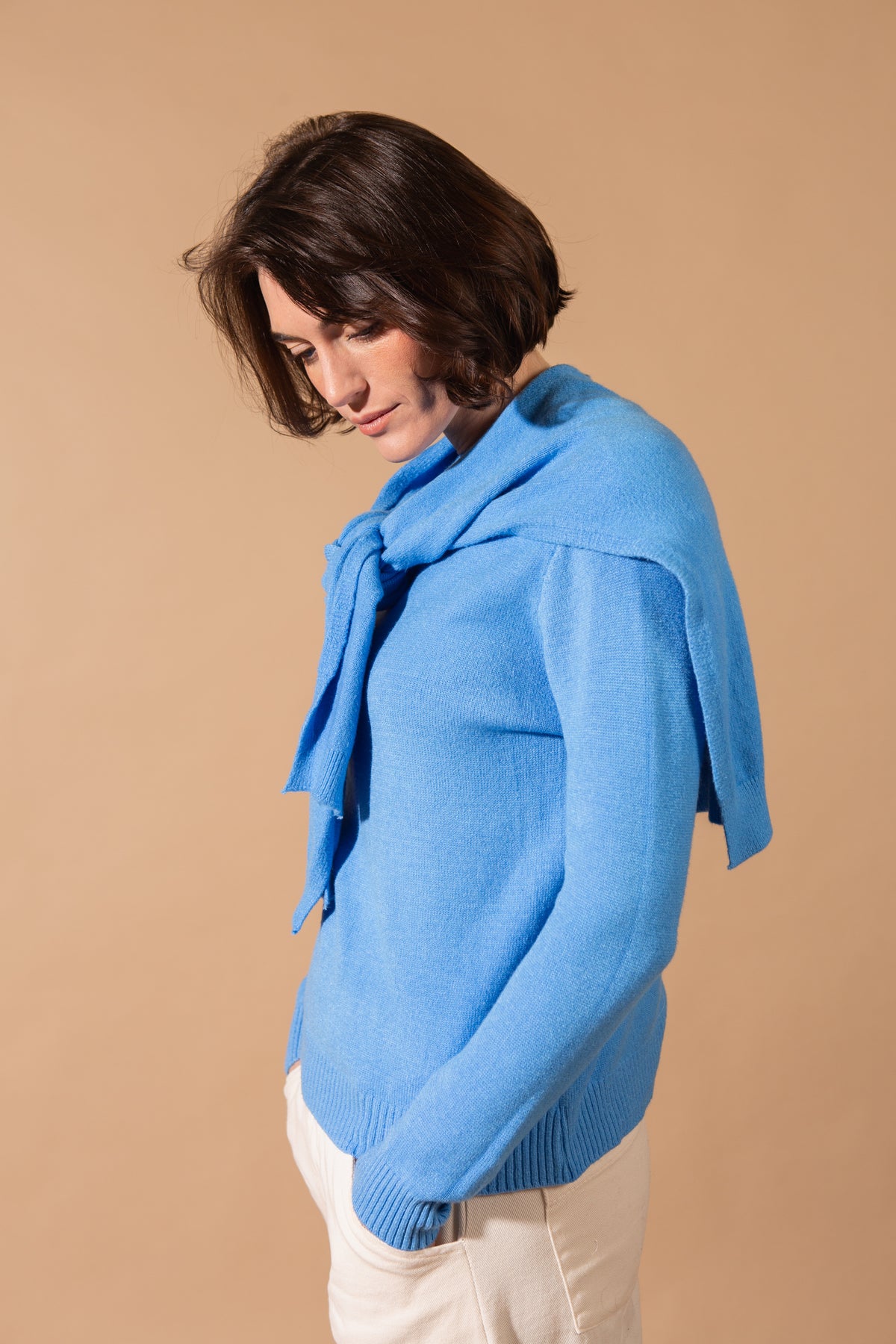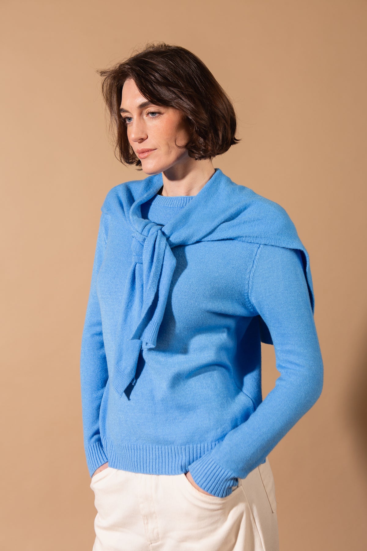 Timeless and chic, this sophisticated jumper features a classic, pullover silhouette, elongated cuffs and a detachable scarf. It will be a piece your customers reach for time and time again.